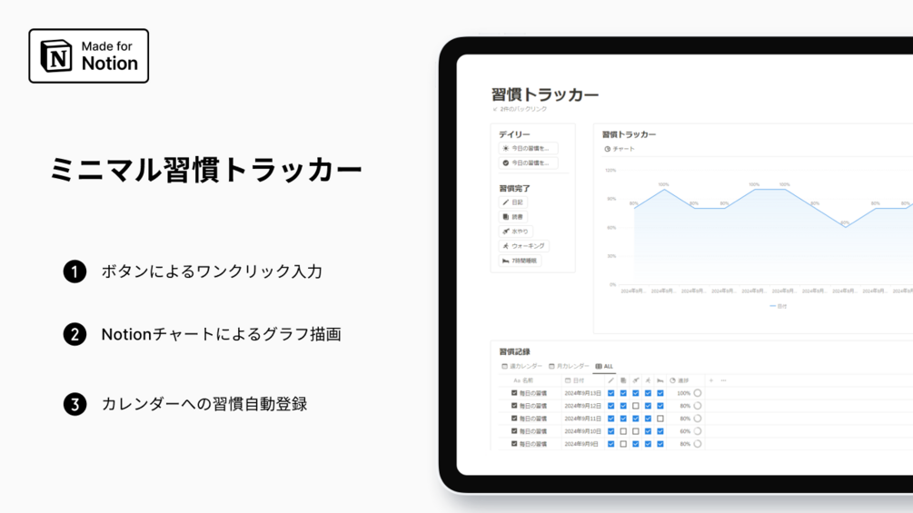 このテンプレートは毎日の習慣の継続をサポートし、その記録をつけていくことでモチベーションを高めてくれます。